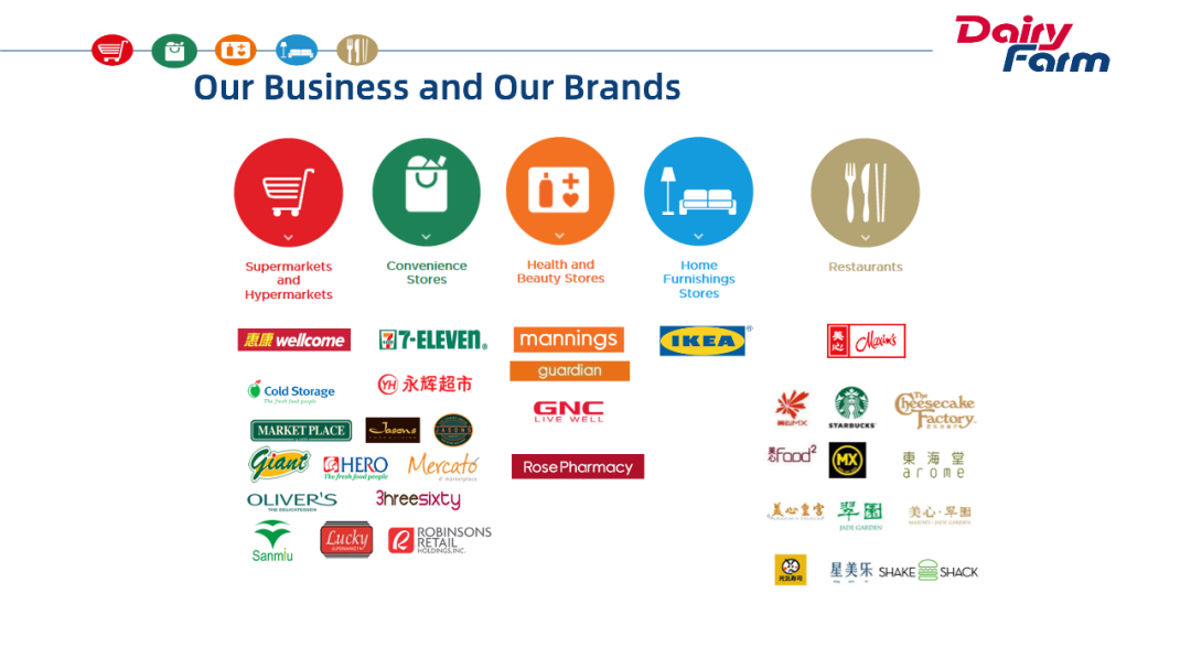 大家熟悉的品牌,包括在香港排名第一的惠康超市,国内的永辉超市、7-Eleven便利店、万宁,港澳台的宜家家居,以及星巴克、星美乐、Shake Shake等品牌。