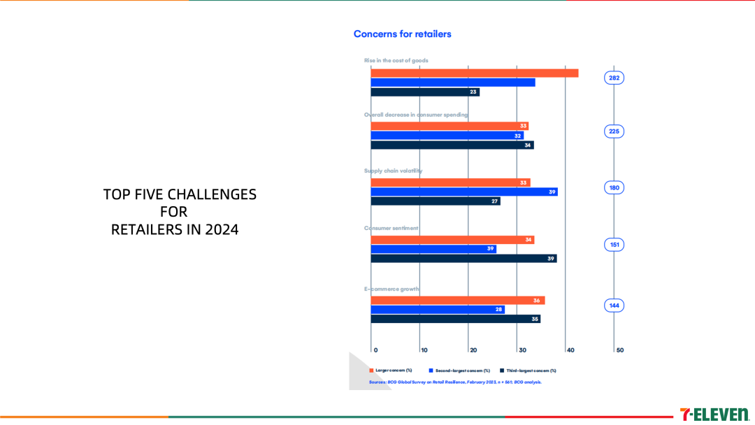 消费习惯的改变对零售业的发展和经营也带来了巨大挑战,根据波士顿公司提供的调研报告,2024年零售行业面临五大挑战,排在第一位的就是商品成本上升,排在第二位的是消费者总体支出减少,三是供应链的不确定性,四是消费者消费意愿,五是电商的增长。