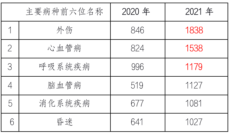 2021年3月15日至22日,北京急救中心共出动急救车辆13093辆,外伤病例1838例,排名第一;心血管疾病1538例,排名第二;呼吸系统疾病1179例,居第三位;